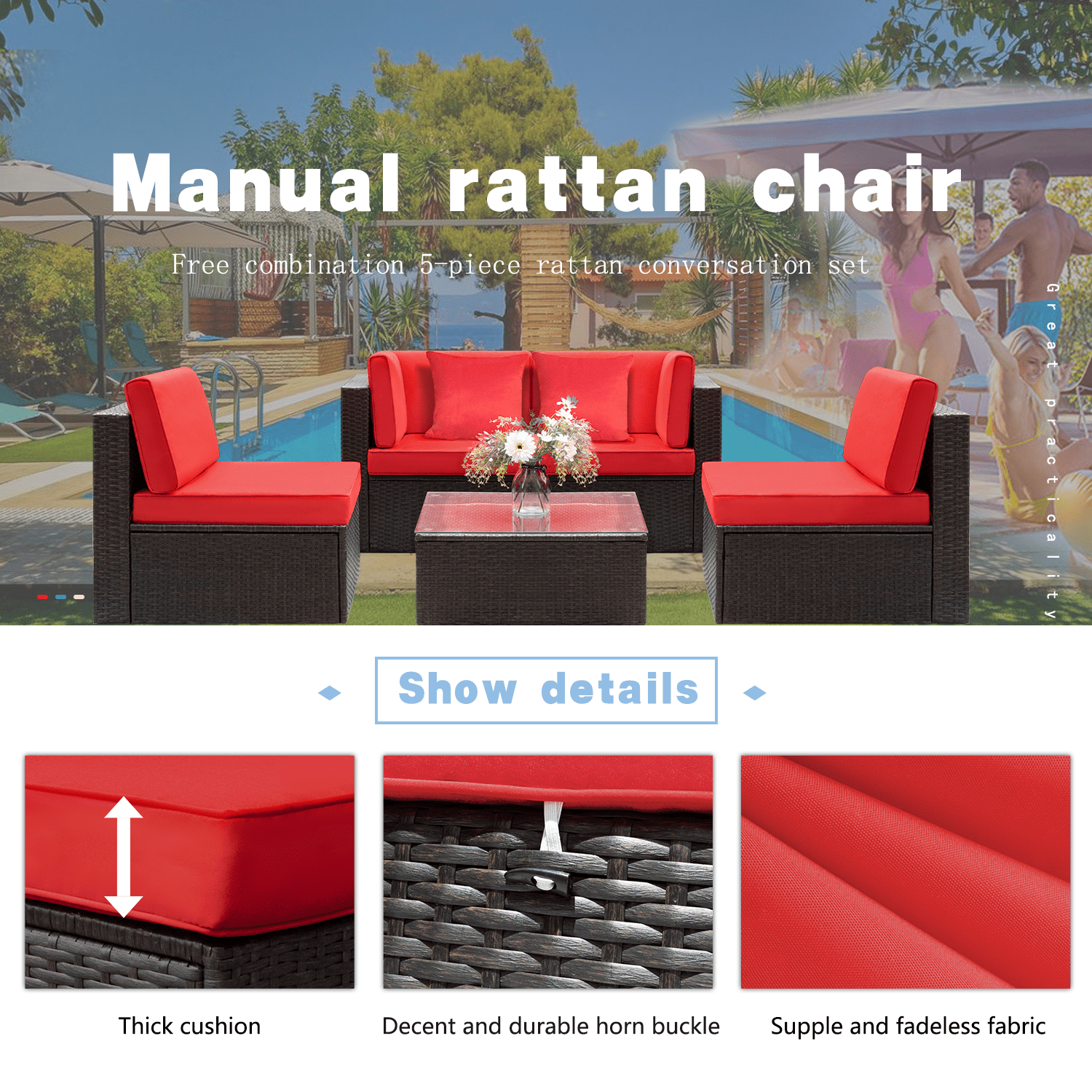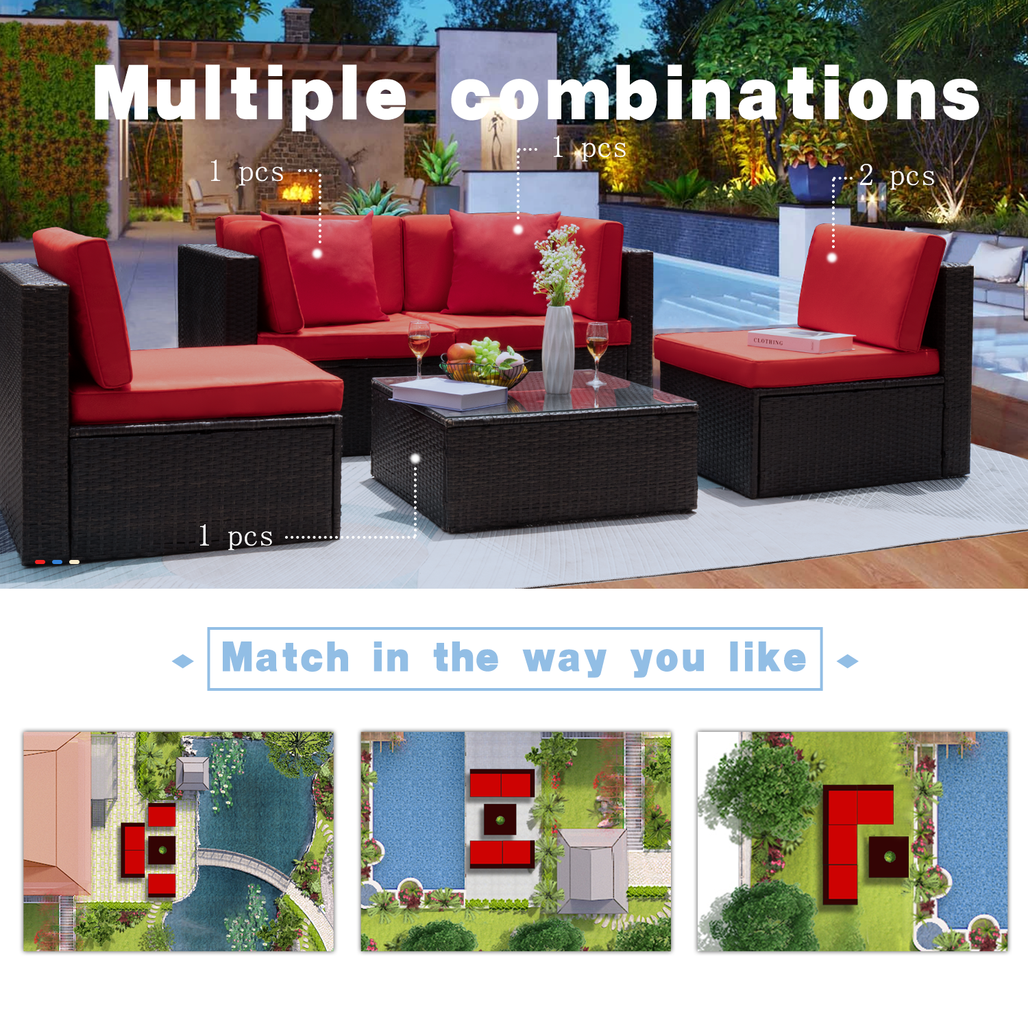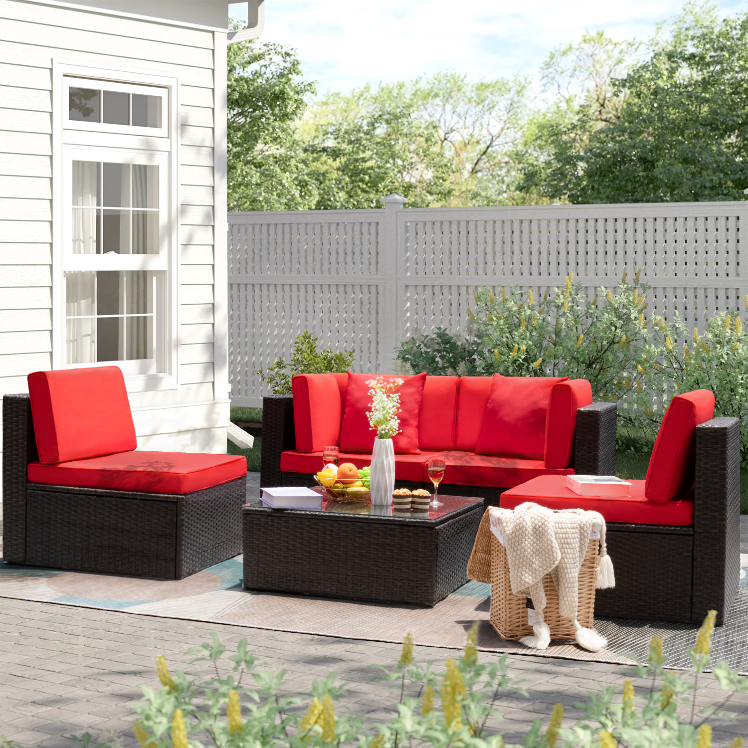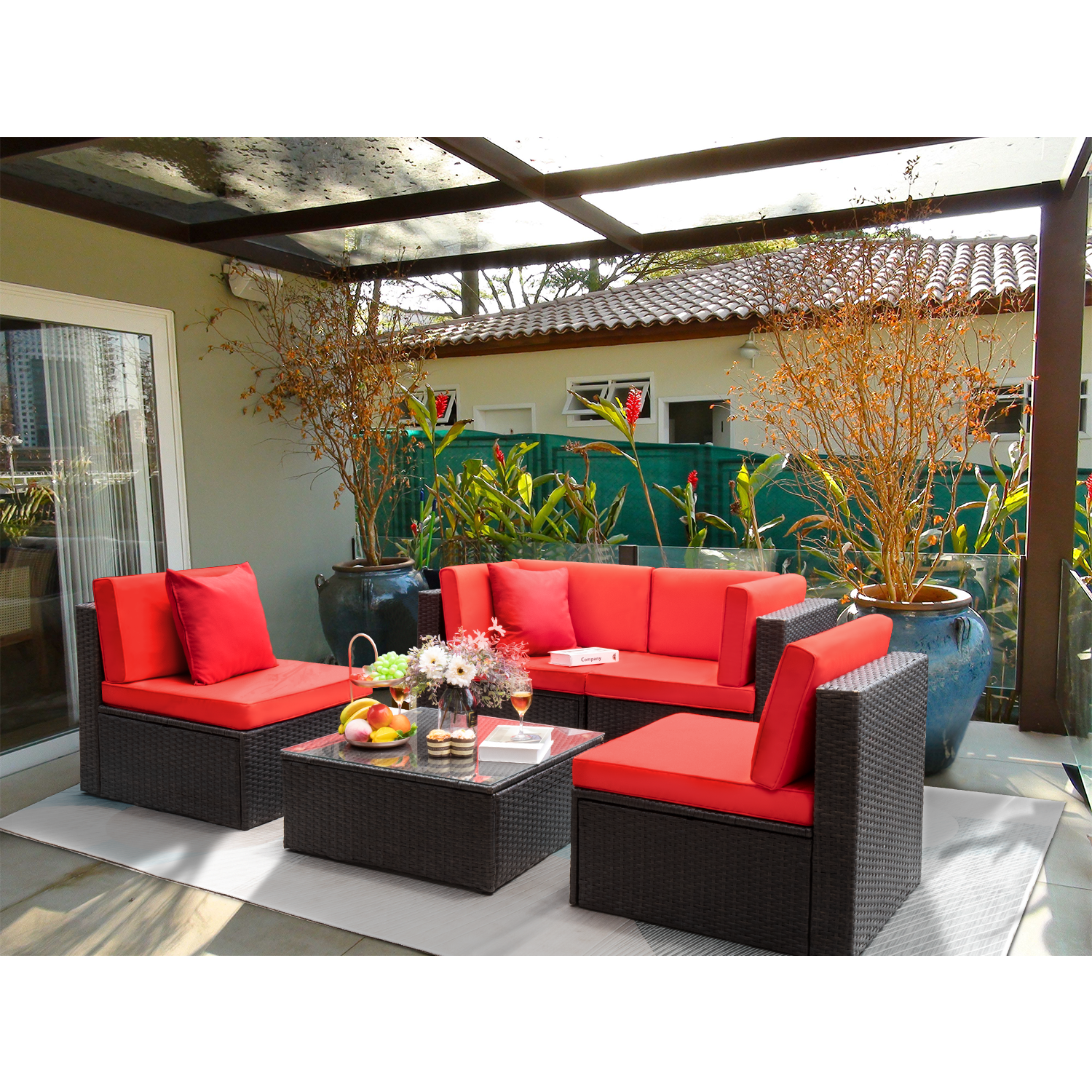 Walnew 5 Pieces Patio Sectional Sofa Set All Weather Wicker Rattan Conversation Sets With Table Red Walmart Com Walmart Com