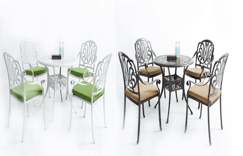 Paint using a spray paint formulated for metal. Lay down a drop cloth and move furniture to a well-ventilated area preferably outside. Cast aluminum patio furniture is quickly becoming the popular choice especially in areas where there is a pool as there is no need to worry about the glass on the dining table or coffee and side tables shattering or breaking.